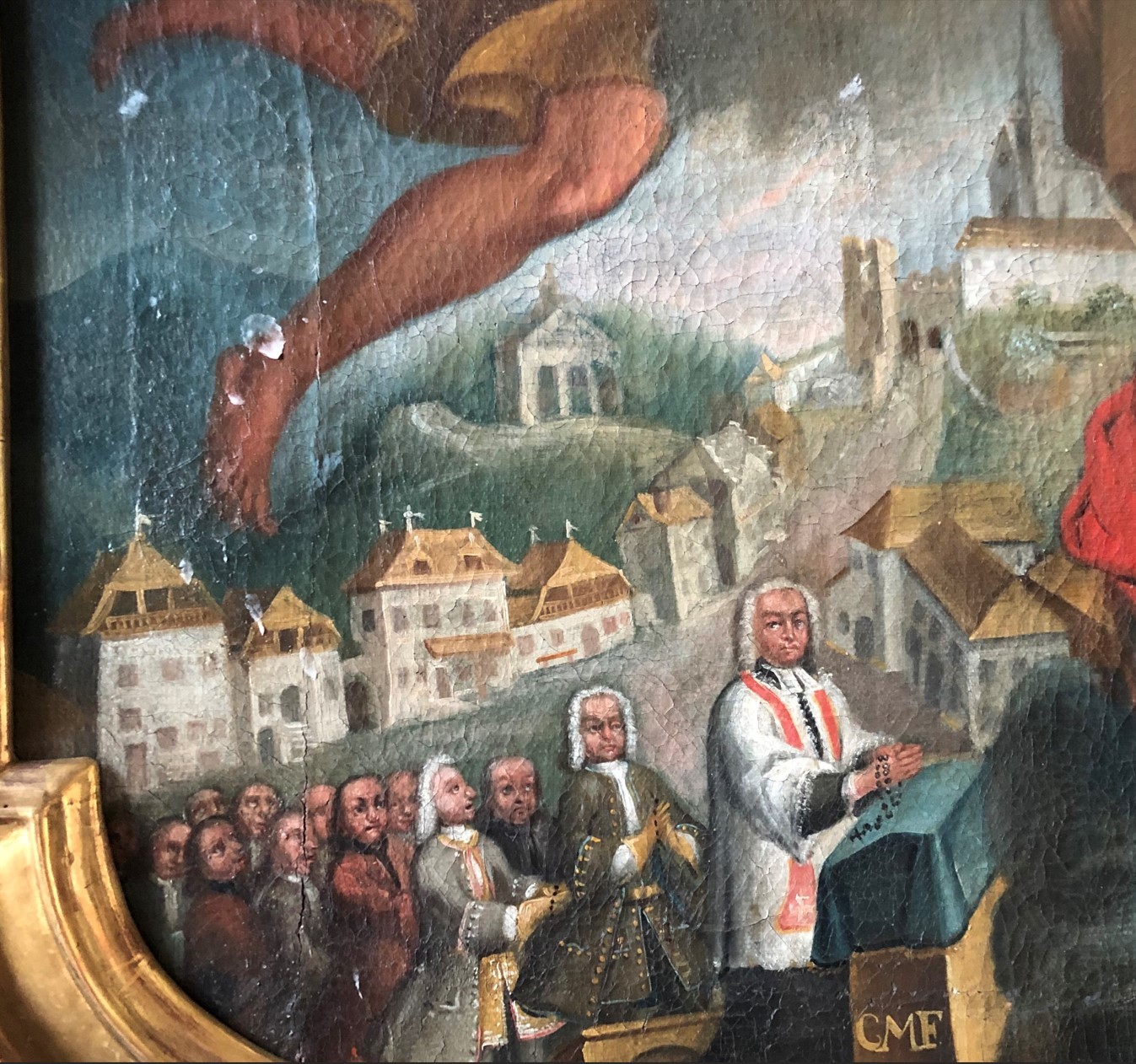 Im linken unteren Teil sieht man einen Pfarrer mit weißer Perücke, kniend an einem Altar betend, dahinter Bürger (es sind nur Männer), ebenfalls kniend betend,3 wobei die ersten beiden mit Weste und prächtigem Herrenrock mit breiten Ärmelaufschlägen bekleidet sind und weiße Perücken mit Lockenrollen tragen. Im Hintergrund ist ein Teil des Oberen Marktes dargestellt, beginnend vom Pilz-Haus am Salzburger Platz die Burgstraße hinauf bis zu Hornturm, Pfarrhaus und Schloss. Im Hintergrund erkennt man die Kalvarienbergkapelle und die Stadtpfarrkirche. Im rechten unteren Teil wurde die fertiggestellte Kirche Maria Hilf festgehalten.